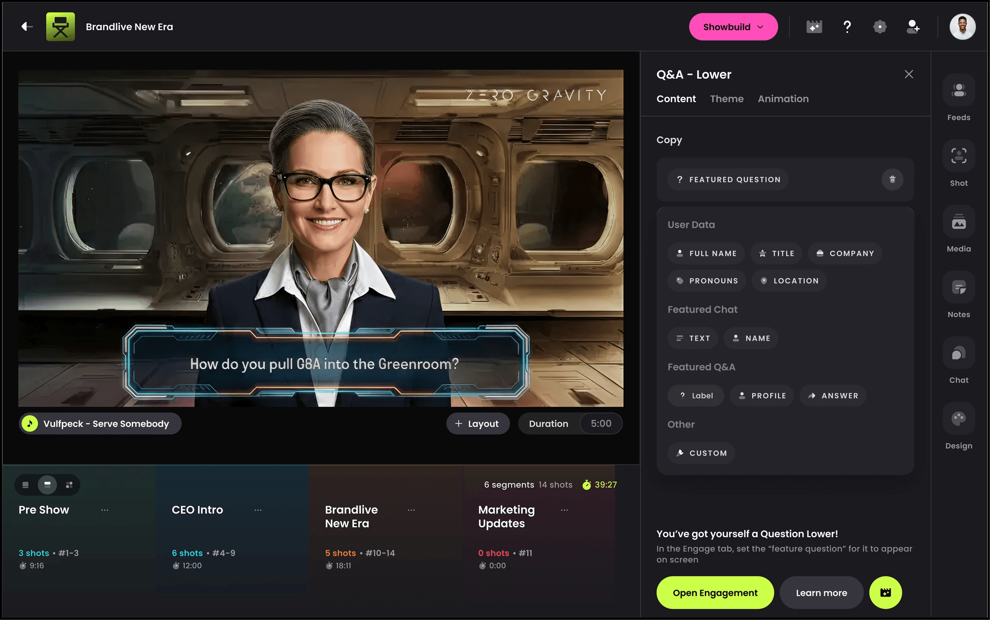 The Greenroom integration links presenters, producers, and participants in real time — layering in the engagement content with audience input directly onto the screen. This imprint helps support the storytelling and drives better on demand experiences.